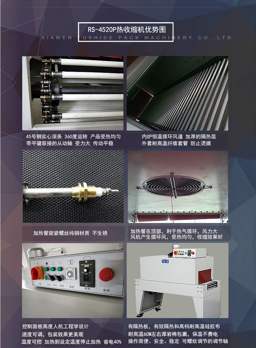 熱收縮機也稱收縮機,熱收縮包裝機,是目前市場比較先進的包裝方法之一,富仕德熱收縮機擁有如下優(yōu)勢: